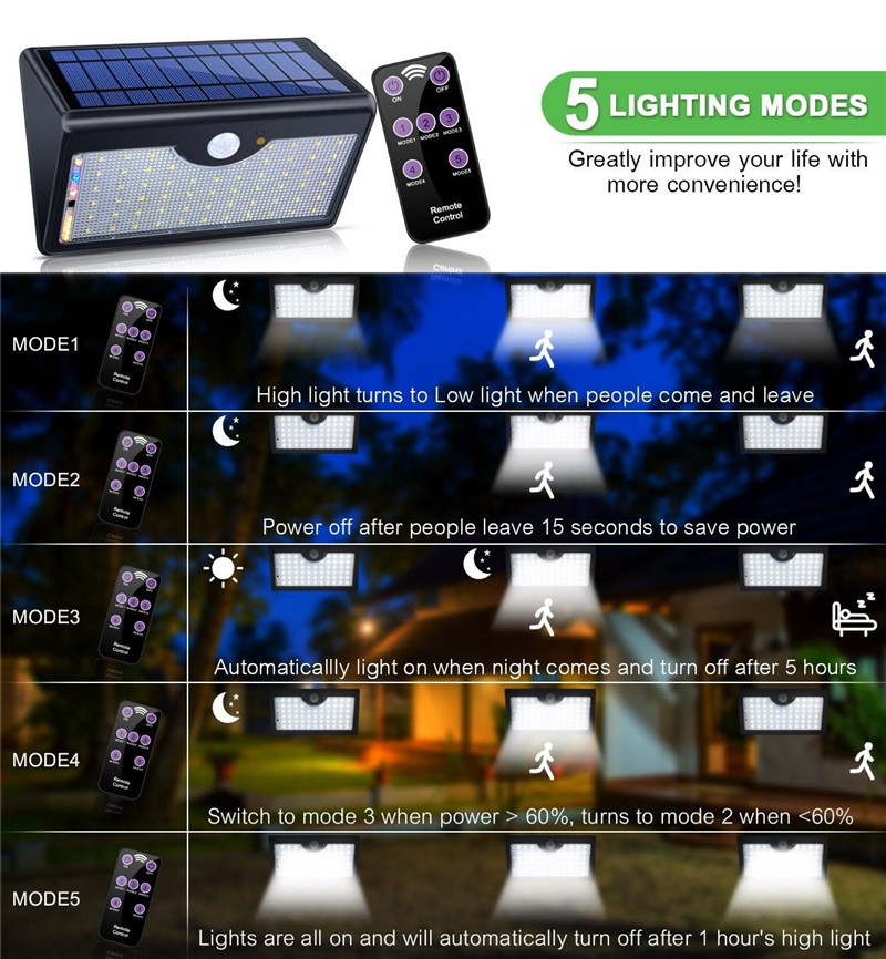 Mode 3: Always light on mode(auto low light when night comes and off after 5