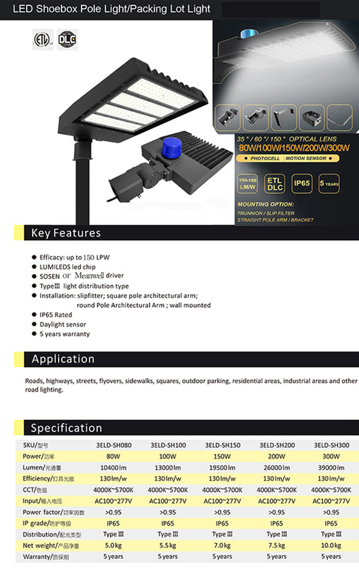 ETL/DLC LED ParkingLot Light /Shoebox Light 80W 100W 150W 200W 300W for option