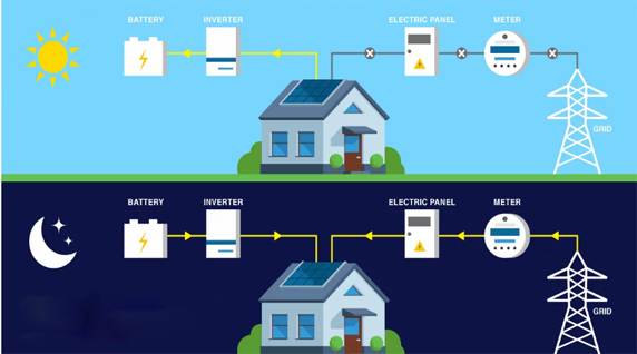 When the sun rises, solar begins powering the home. When additional power is required within the home, the home can then pull from the utility grid. The battery system charges by solar during the day, when solar panels are producing more electricity than the home is consuming. The solar battery system then stores that energy until the home needs it, such as when solar is no longer producing at night, or when the utility grid is offline during a power outage.